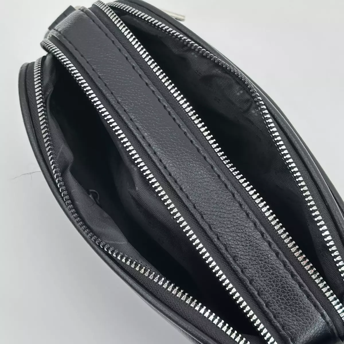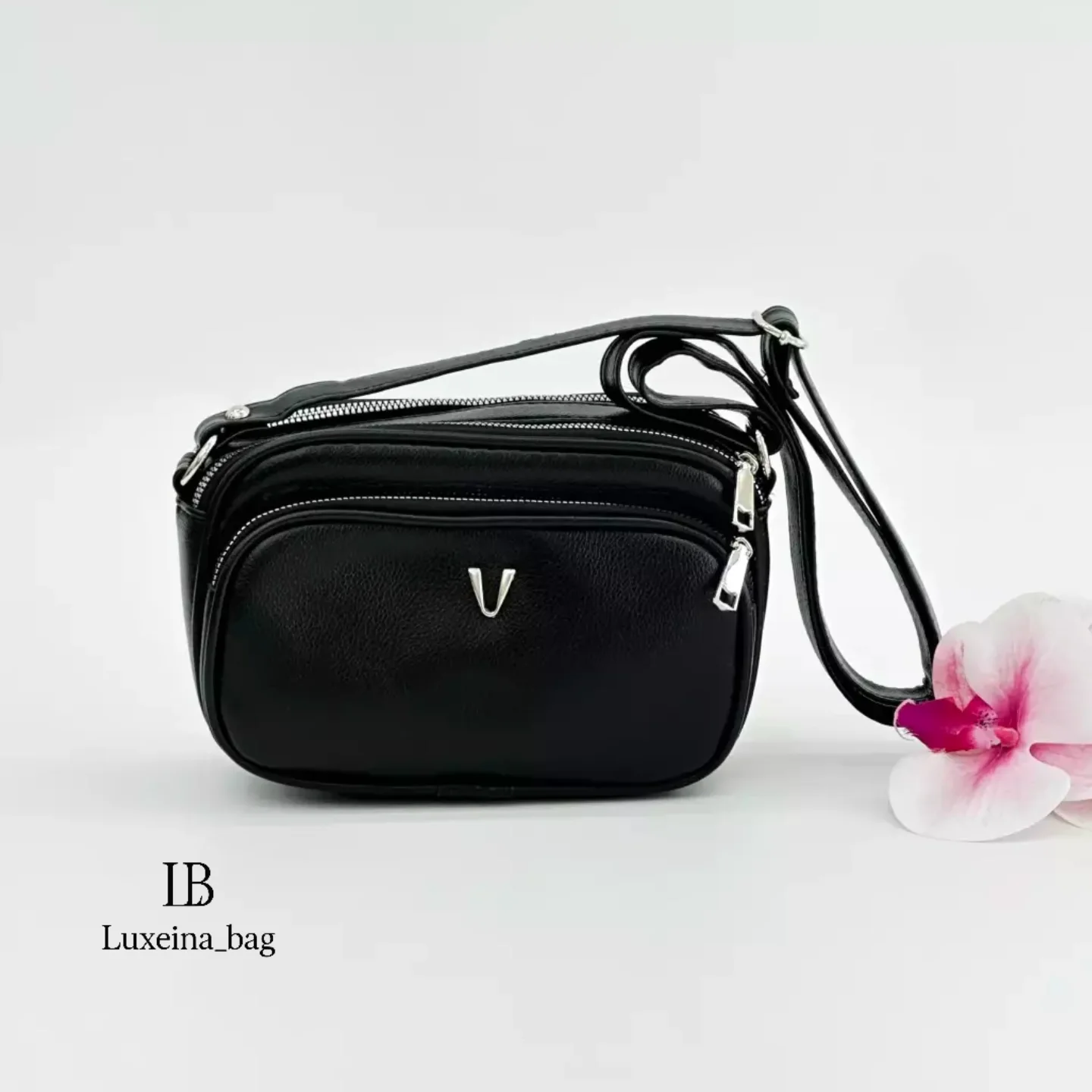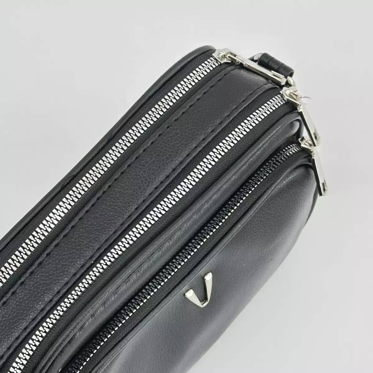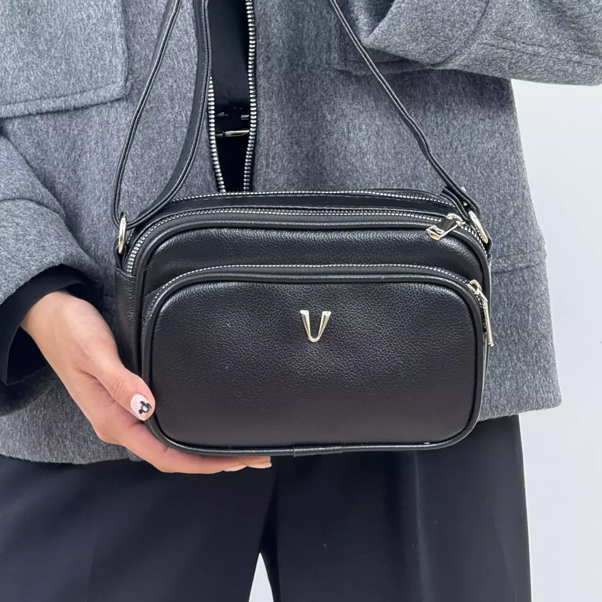 این کیف کاربردی با رنگ جذاب مشکی، بهراحتی با هر تیپ و لباسی ست میشود. طراحی مینیمال، سه زیپ با سه اتاقک کاربردی و یراقهای نقرهای براق، ظاهری لوکس و خاص ایجاد کردهاند. در قسمت جلوی کیف، لوگوی ظریف V نمایی ساده اما شیک به آن بخشیده است.